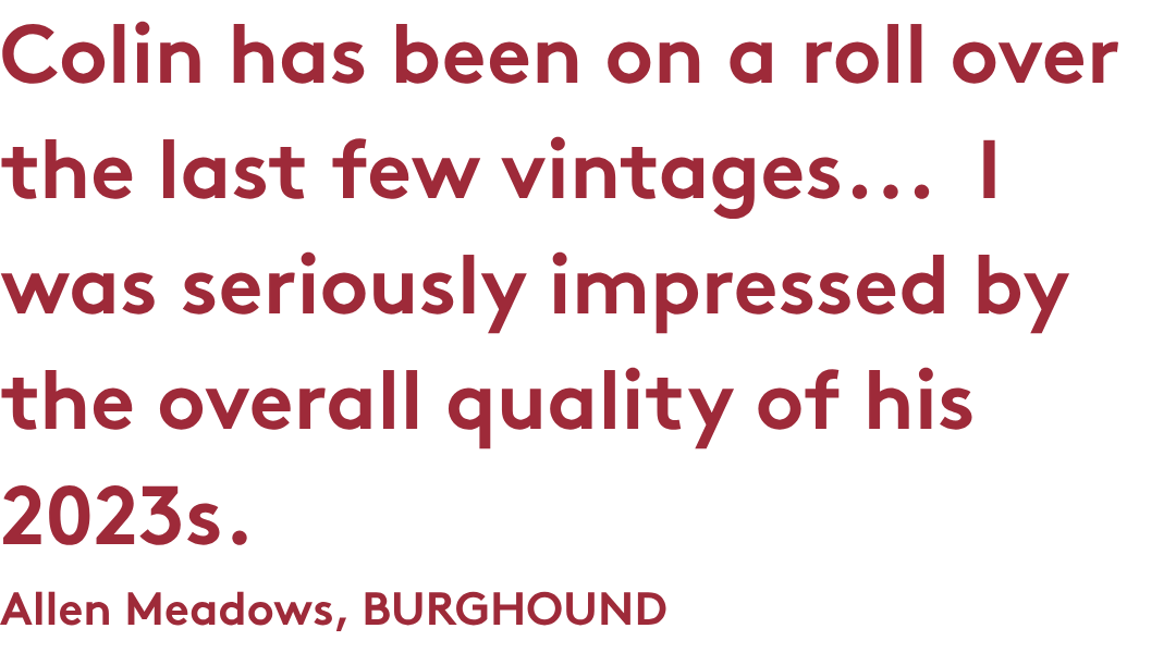 The 2023 vintage is an absolute triumph for Colin. The wines are full of character and exhibit more freshness and elegance than their 2022 counterparts. Superb drive and length are hallmarks across the board; however, it is in the premier crus where Colin's wines truly begin to shine.